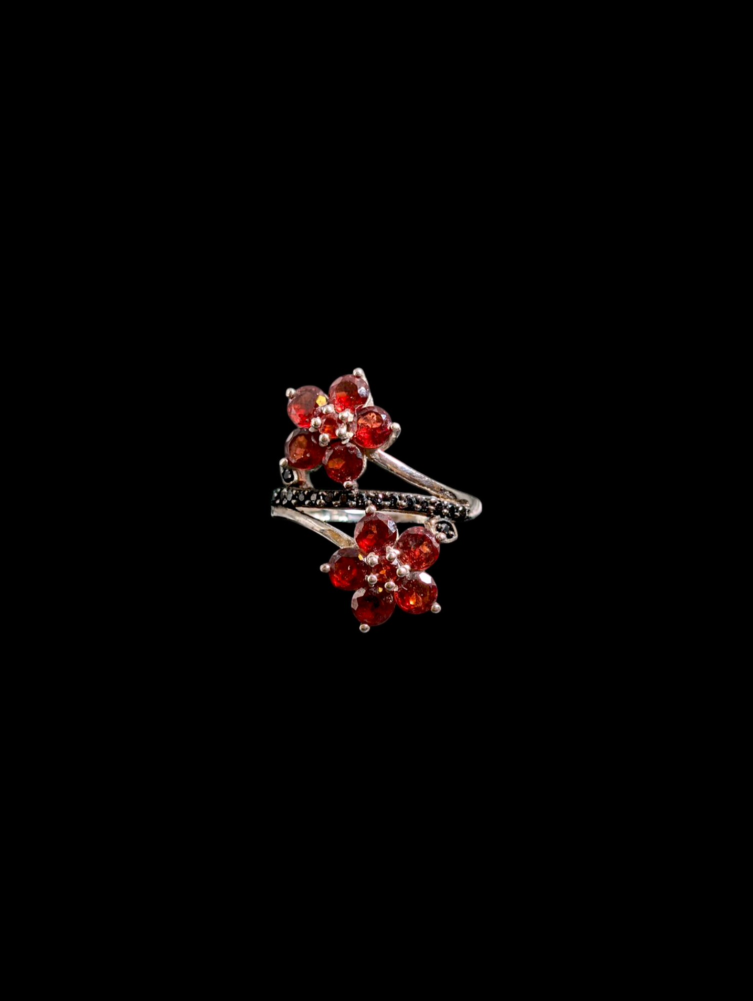 Vintage Double Flower Crossover Genuine Pyrope Garnet and Black Onyx Sterling Silver Ring