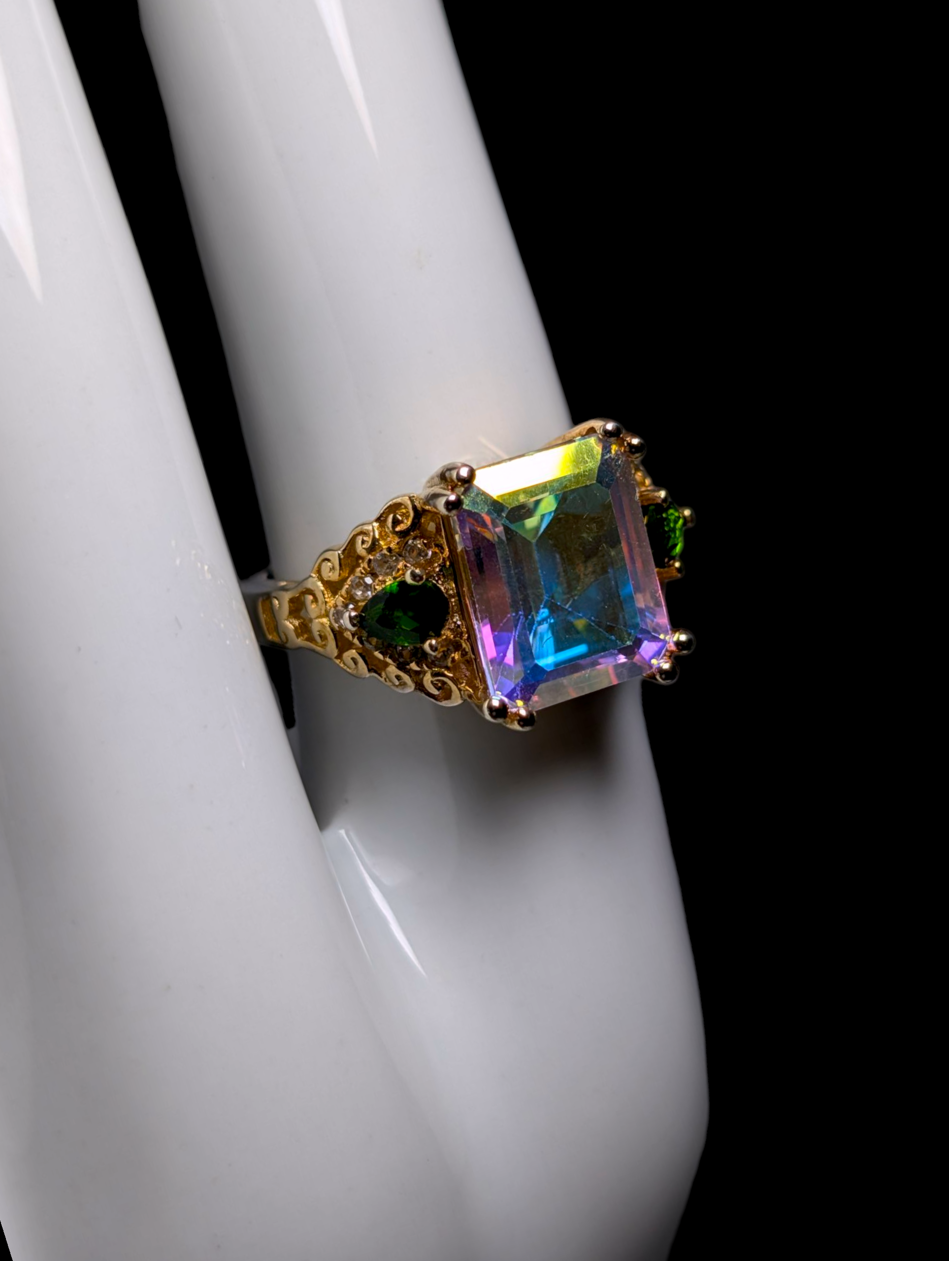 Vintage Emerald Cut Solitaire Genuine Mystic Topaz with Chrome Diopside and Zircon Accents 14k and Sterling Silver Ring