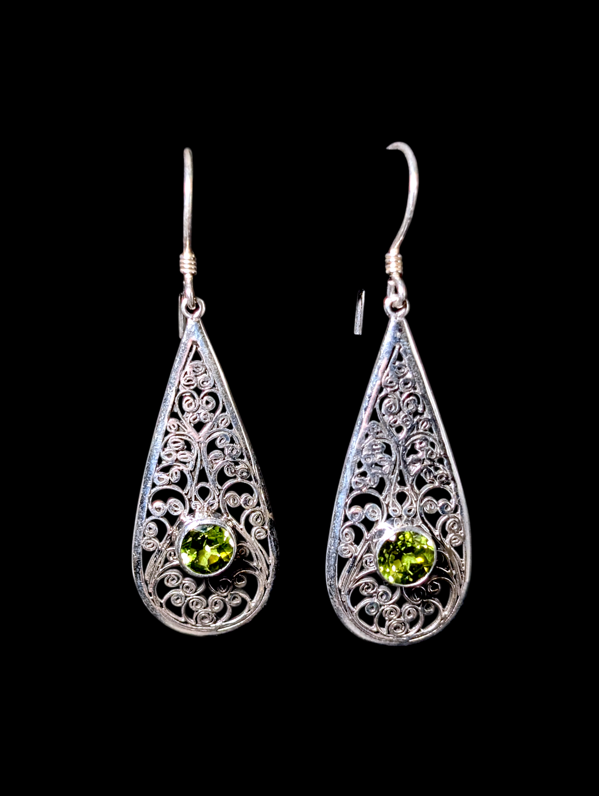 Vintage Bezel Set Round Cut 2 Carat Genuine Peridot Sterling Silver Filigree Drop Earrings