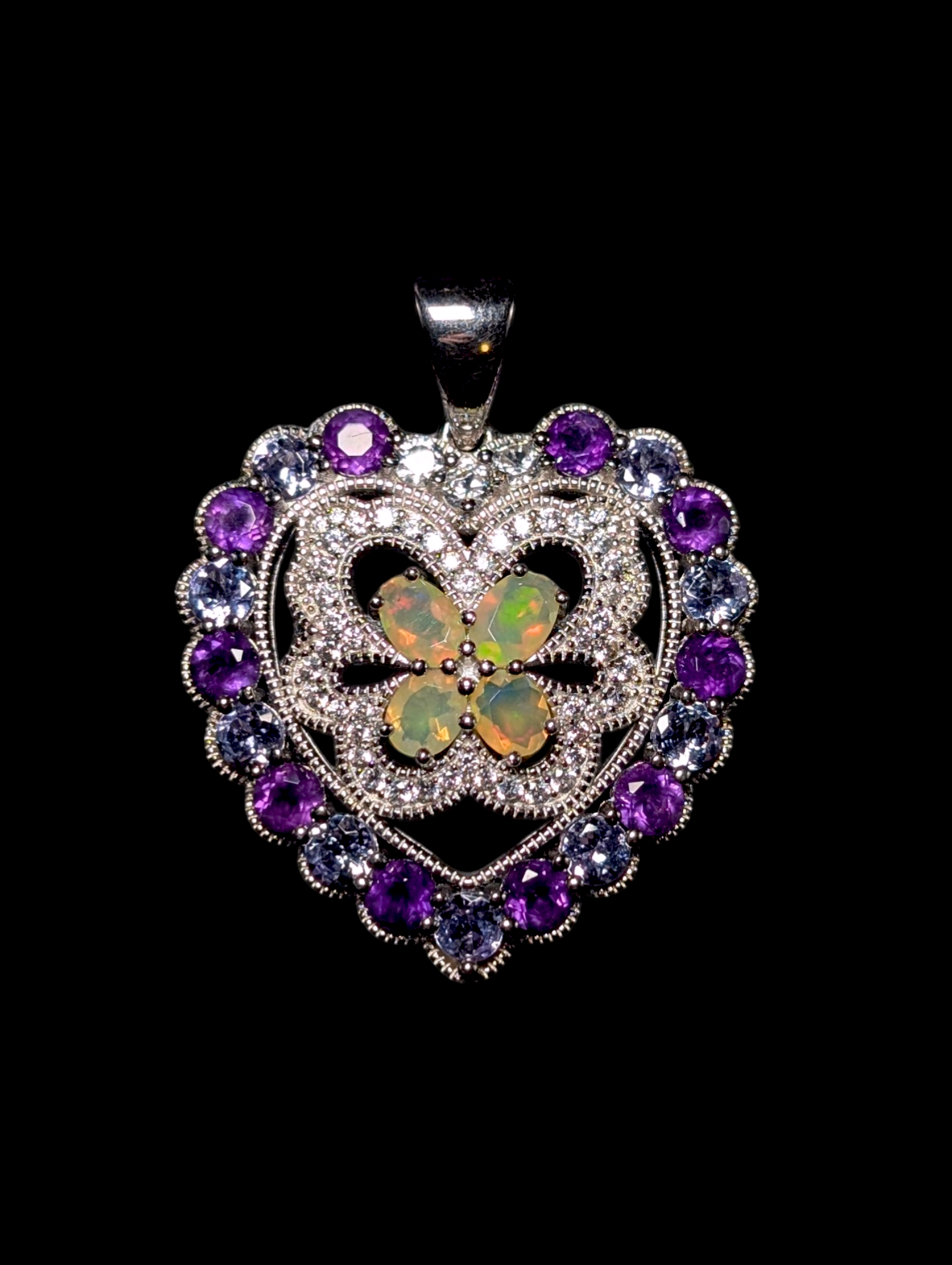 Vintage Butterfly and Heart Genuine Ethiopian Opal, Amethyst, Tanzanite and White Topaz Halo Sterling Silver Pendant