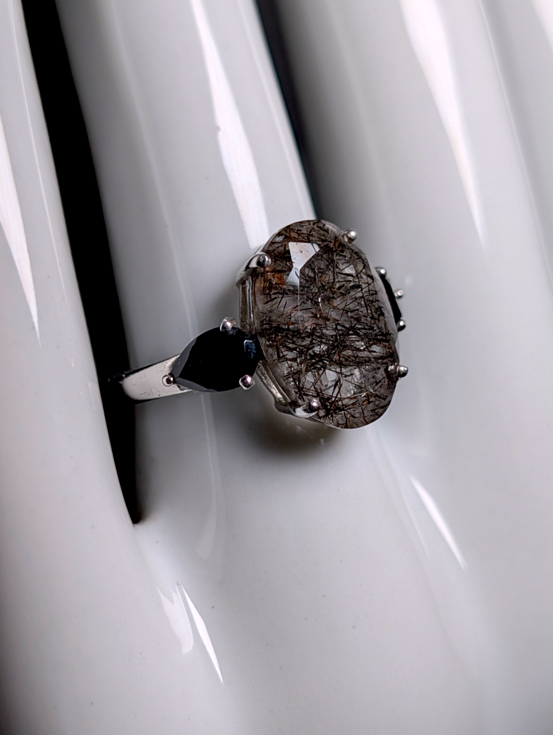 Vintage Oval Cut Earth Mined Genuine Rutilated Quartz and Black Onyx Sterling Silver Statement Ring
