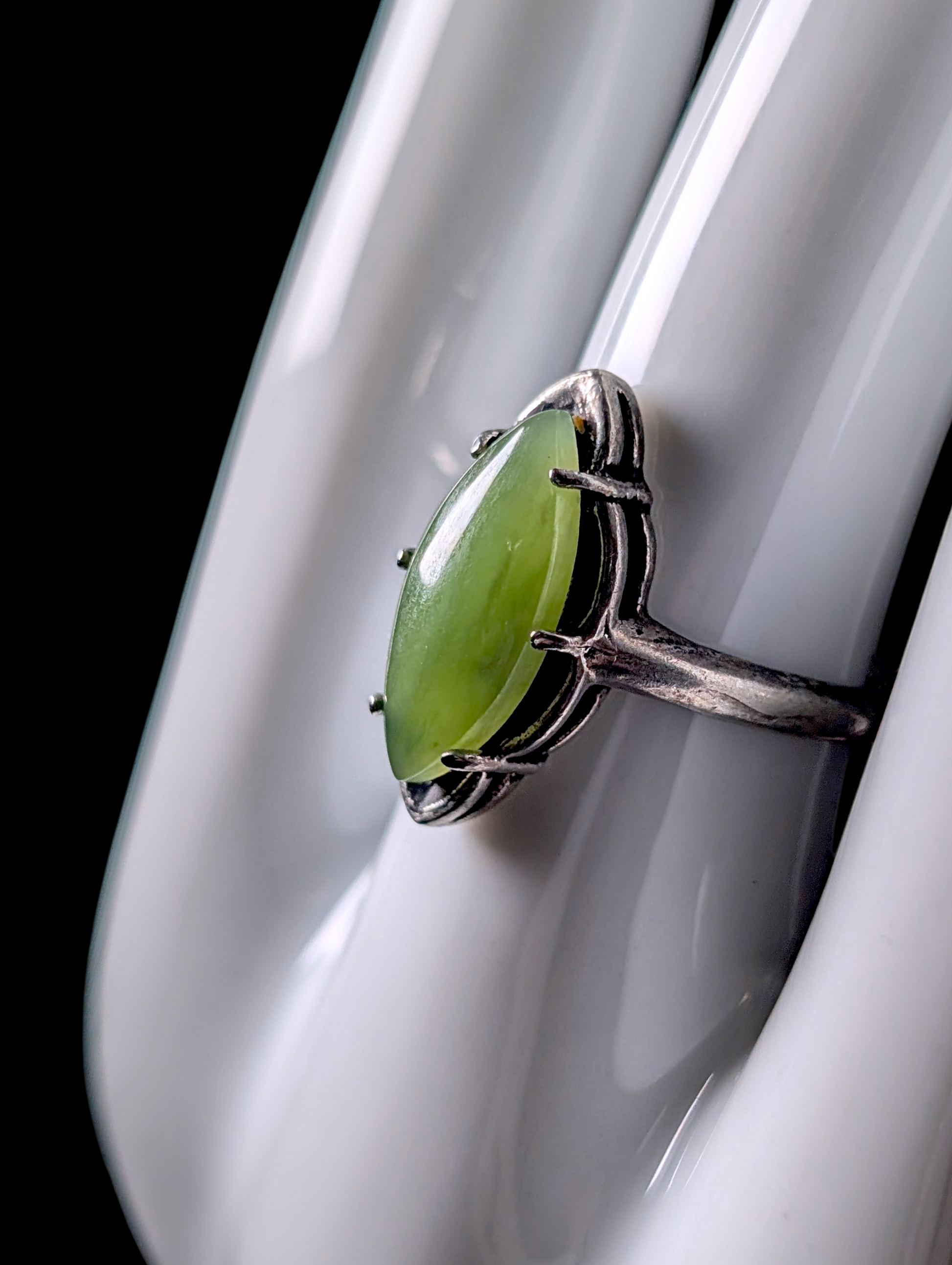 Vintage Marquise Cut Earth Mined Genuine Jade Solitaire with Scalloped Detailing Sterling Silver Ring