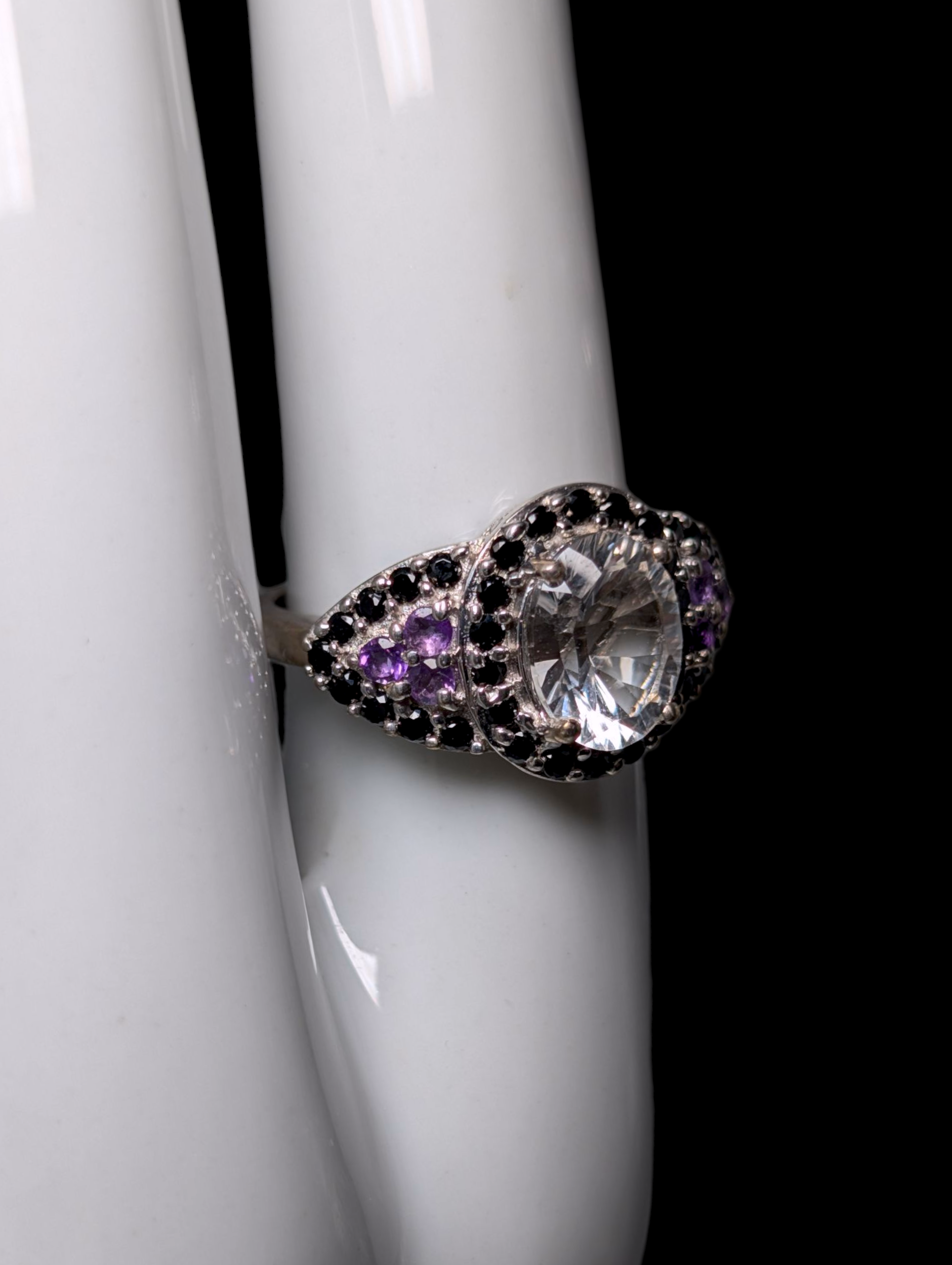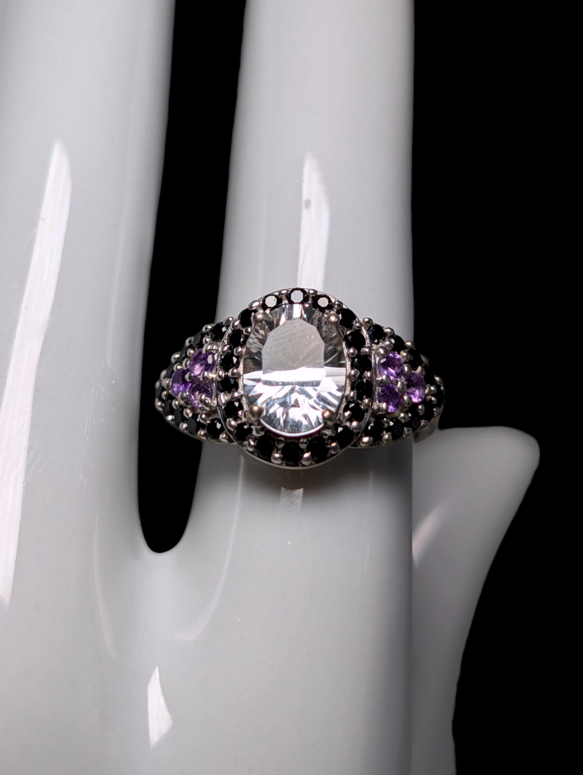 Vintage Oval Cut Earth Mined Genuine Rock Crystal Quartz Solitaire with Black Onyx Halo and Amethyst Accents Sterling Silver Ring