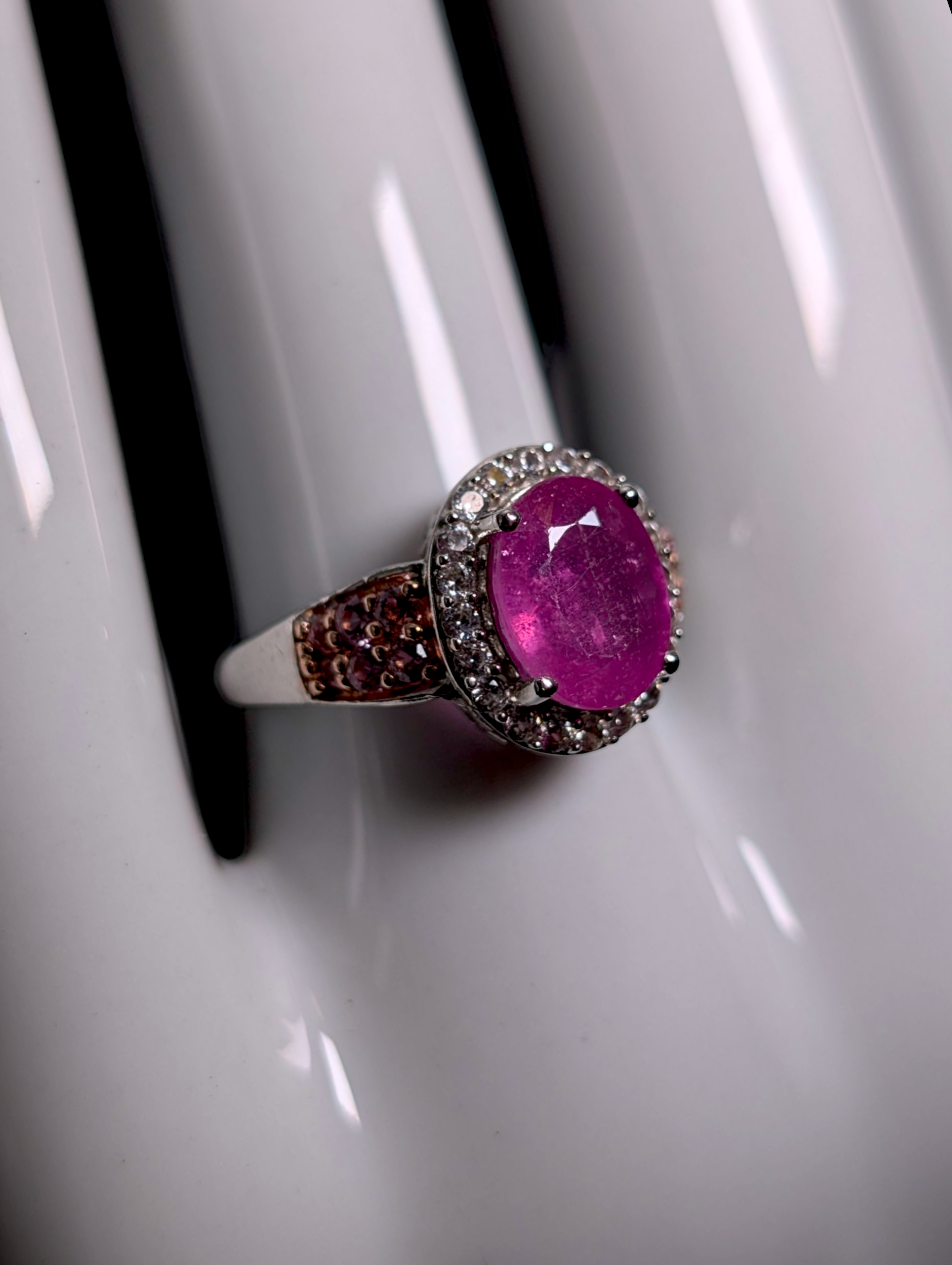 Vintage Oval Cut Earth Mined Genuine Ruby, Pink Sapphire and White Topaz Halo Sterling Silver Statement Ring