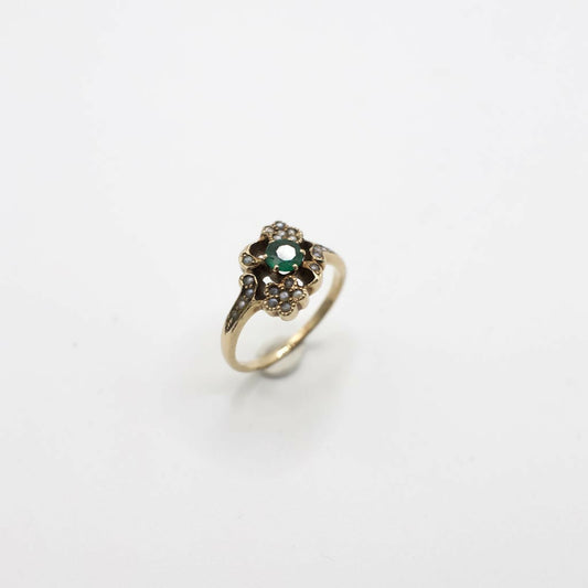 Vintage Genuine Emerald and Seed Pearl Ring In 10K Yellow Gold