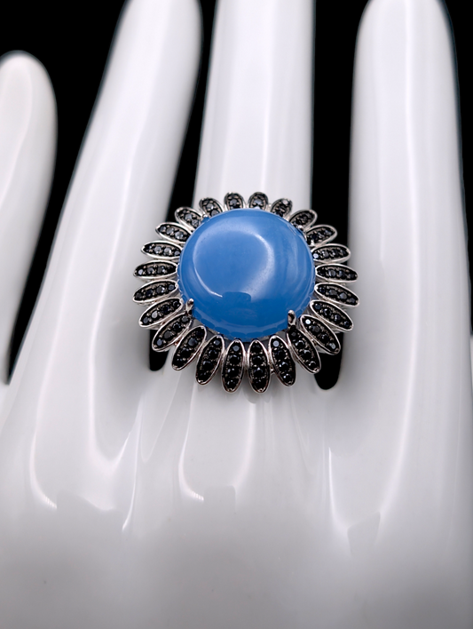 Vintage Inspired Blue Jadeite Cabochon Gumdrop Flower with Black Onyx Petals Sterling Silver Ring