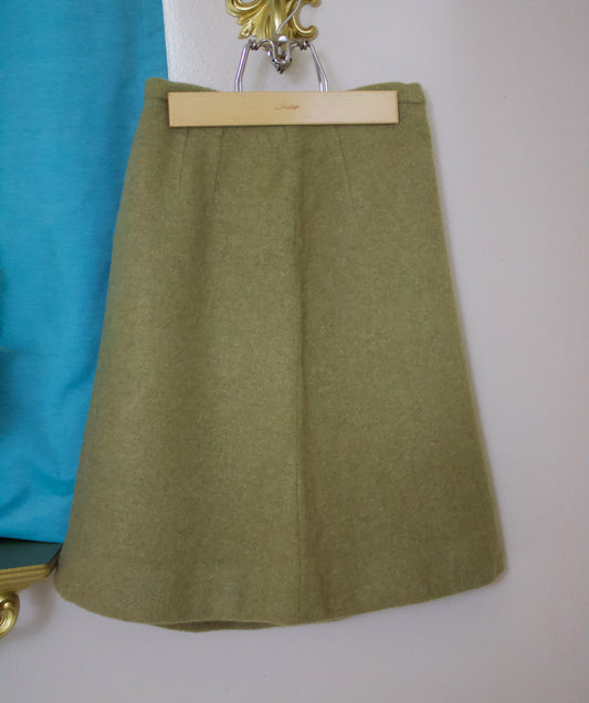 1960s Olive Green Wool Skirt with Mother of Pearl Style Button