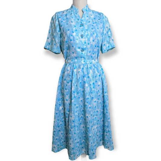 1980s Does 1940s Two Piece Blouse and Pleated Skirt Set With Blue Daisies and Glamorous Buttons