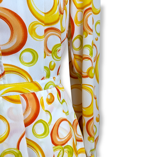 1970s Two Piece Blouse and Pleated Skirt Set With Yellow and Orange Mod Circle Pattern, Butterfly Collar, Long Sleeves and Groovy Buttons