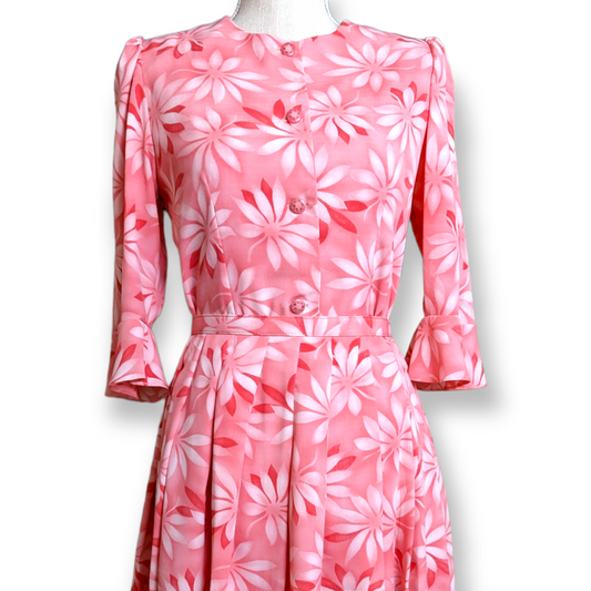 1980s Pink Silk Chiffon Two Piece Blouse and Pleated Skirt Set With White and Pink Foliage Tropical Pattern, Scoop Collar, Long Ruffled Sleeves and Beautiful Flower Buttons