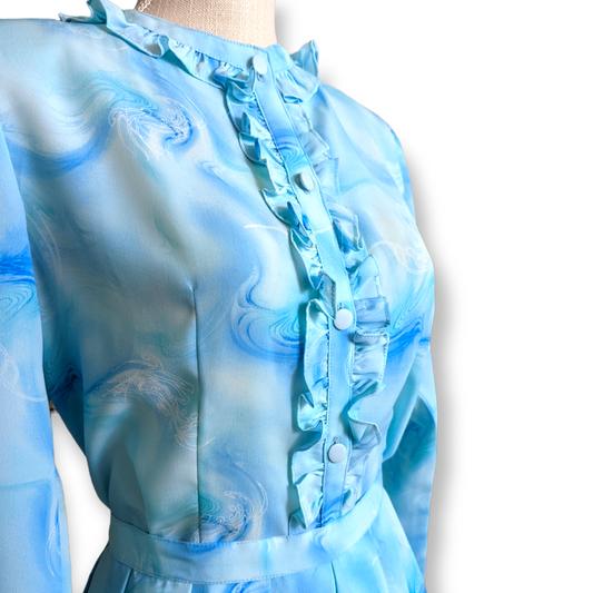 1980s Silk Blue Watercolor Two Piece Blouse and Pleated Skirt Set With Ruffle Details, Rounded Collar, Long Sleeves and Charming Soft Blue Buttons