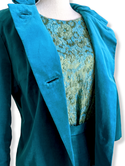 1960s Emerald Green, Lime, Blue and Teal Velour Velvet Brocade 3 Piece Skirt Suit with Blazer Jacket, Sleeveless Blouse and Matching Pencil Skirt Handmade