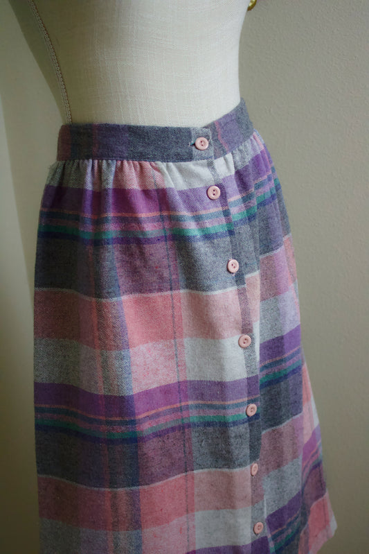 1980s Kayo Italian Wool Blend Mid Length Skirt with Pink Buttons in Blue, Pink and White Flannel