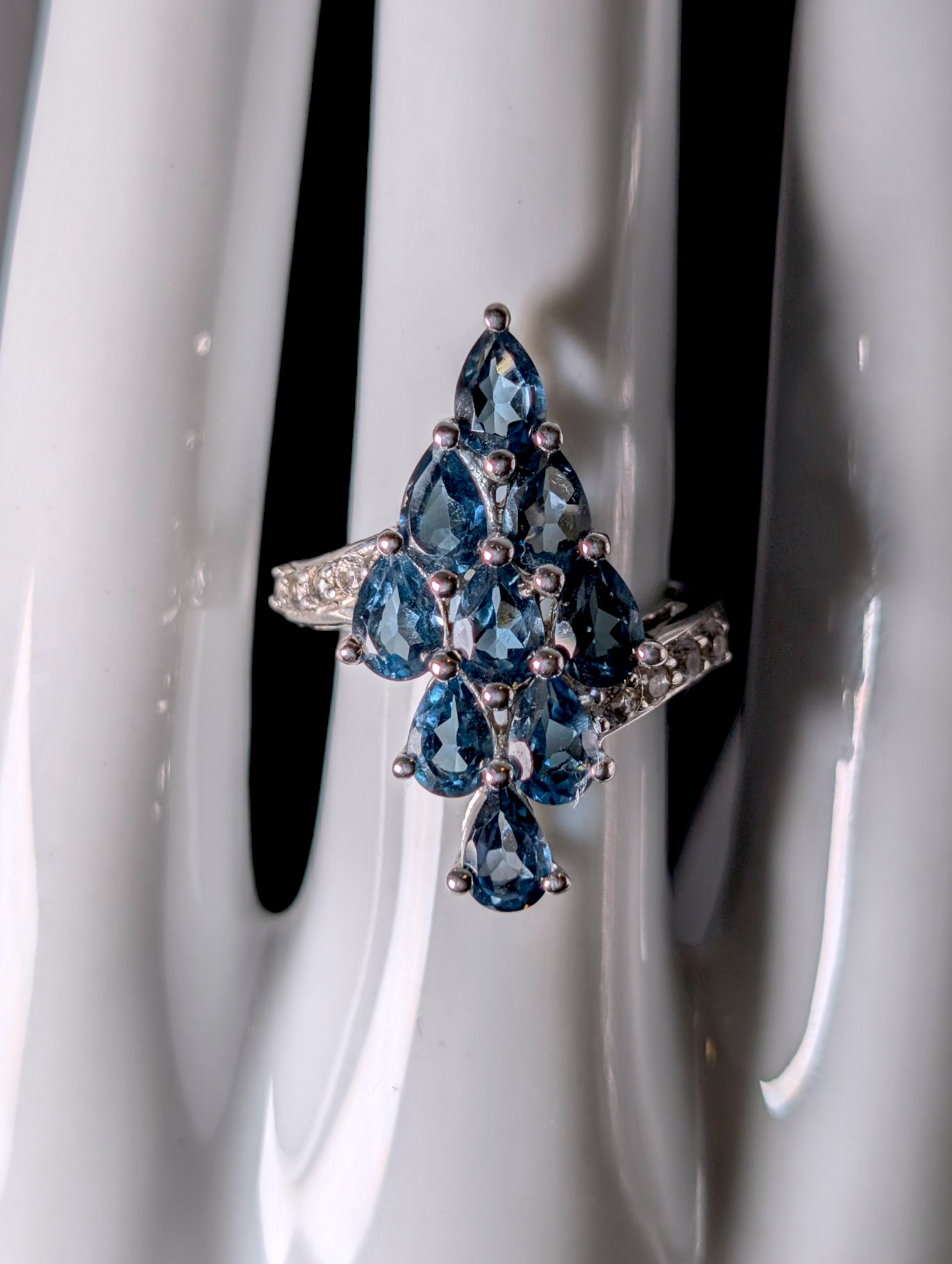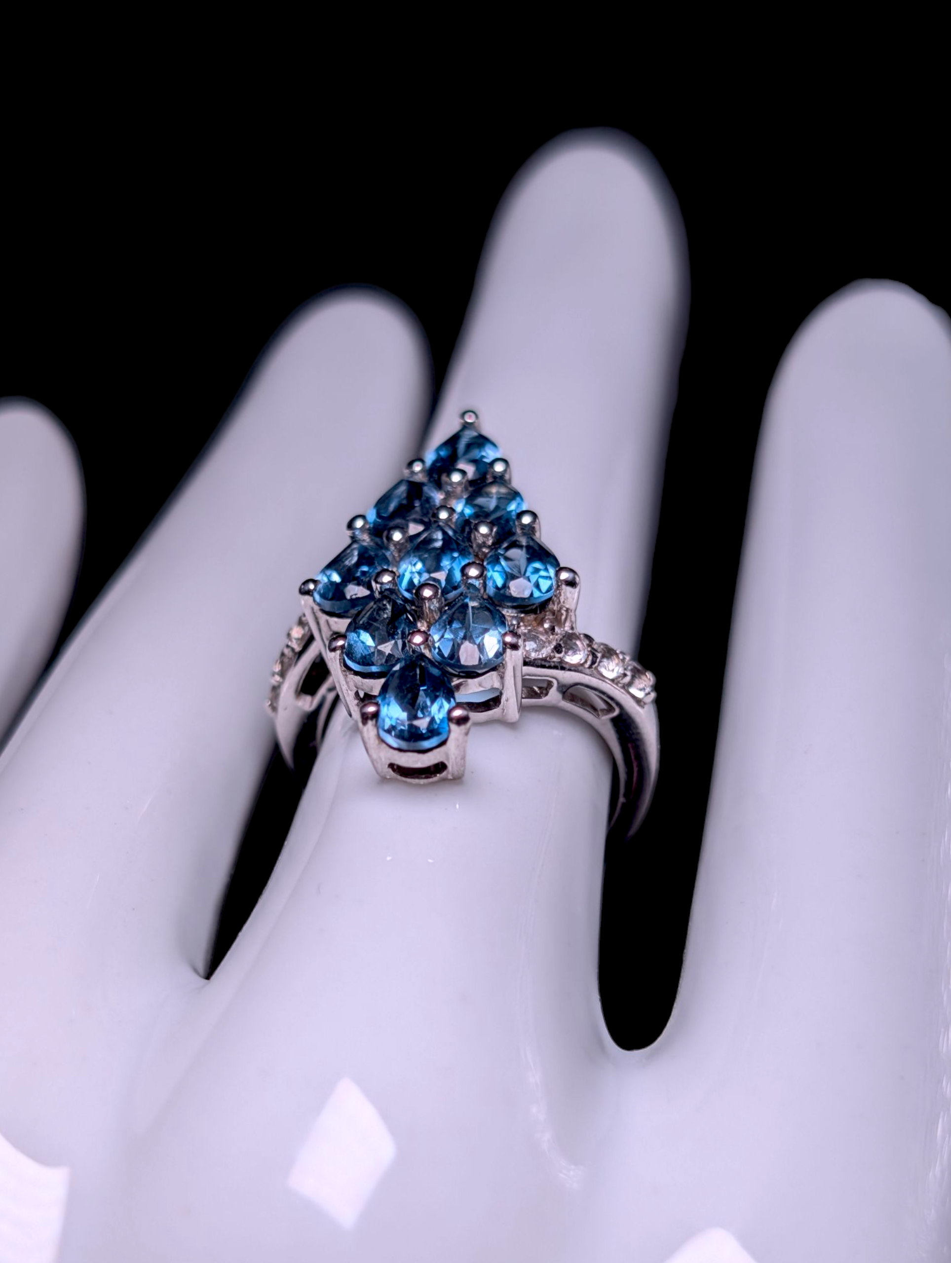 Vintage 4.5 Carat Waterfall Cluster Pear Cut Genuine London Blue Topaz and White Topaz Sterling Silver Ring