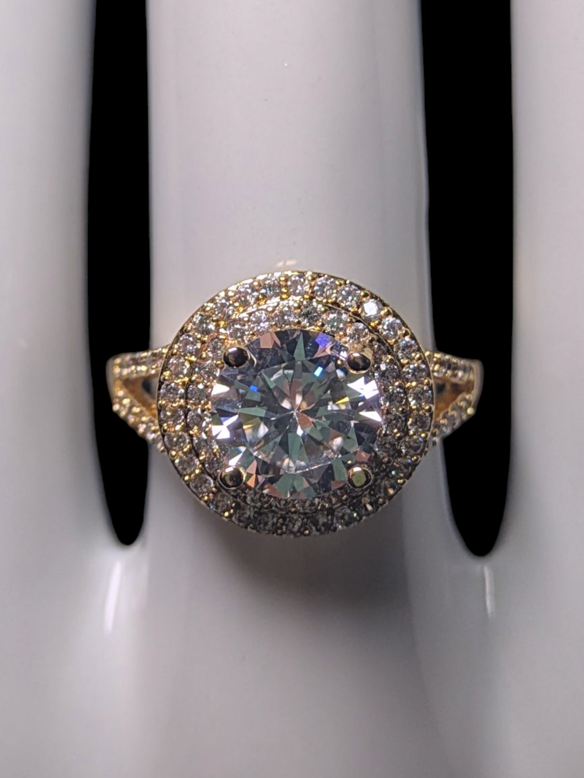 Vintage Inspired Round Cut Simulated Diamond Solitaire with Simulated Diamond Double Halo and Accented Band Gold Toned Vacation Ring